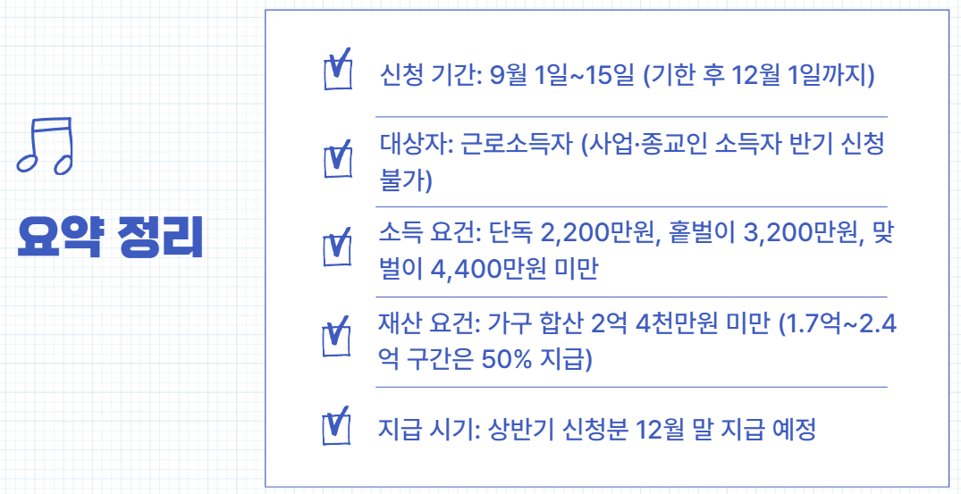 - 재산 요건: 가구 합산 2억 4천만 원 미만 (1.7억~2.4억 구간은 50% 지급)