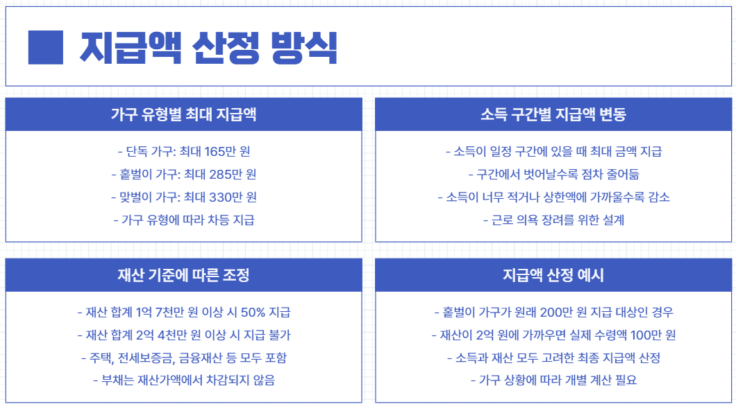 예를 들어 홑벌이 가구가 원래 200만 원을 받을 수 있는 상황이라도, 재산이 2억 가까이 된다면 실제 수령액은 100만 원에 불과할 수 있습니다.