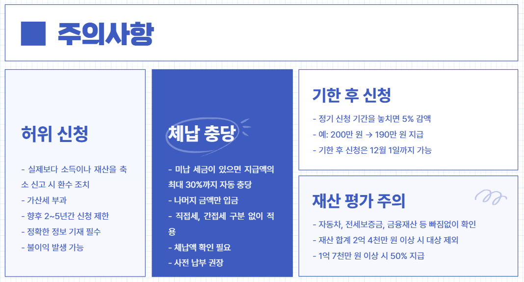 - 주의 사항: 허위 신청·체납 충당·기한 후 감액 유의